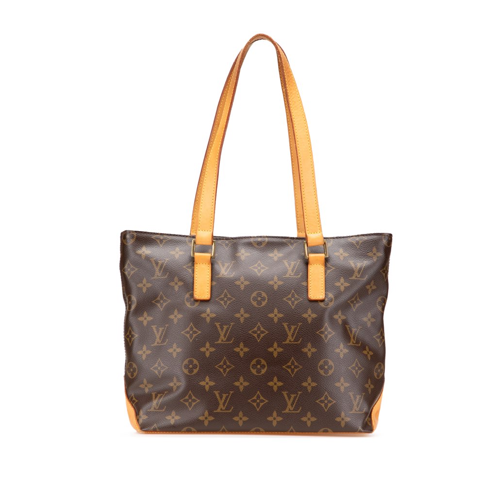 The Cabas Piano features a monogram canvas body, flat vachetta leather handles, a top zip closure, and interior zip and slip pockets.