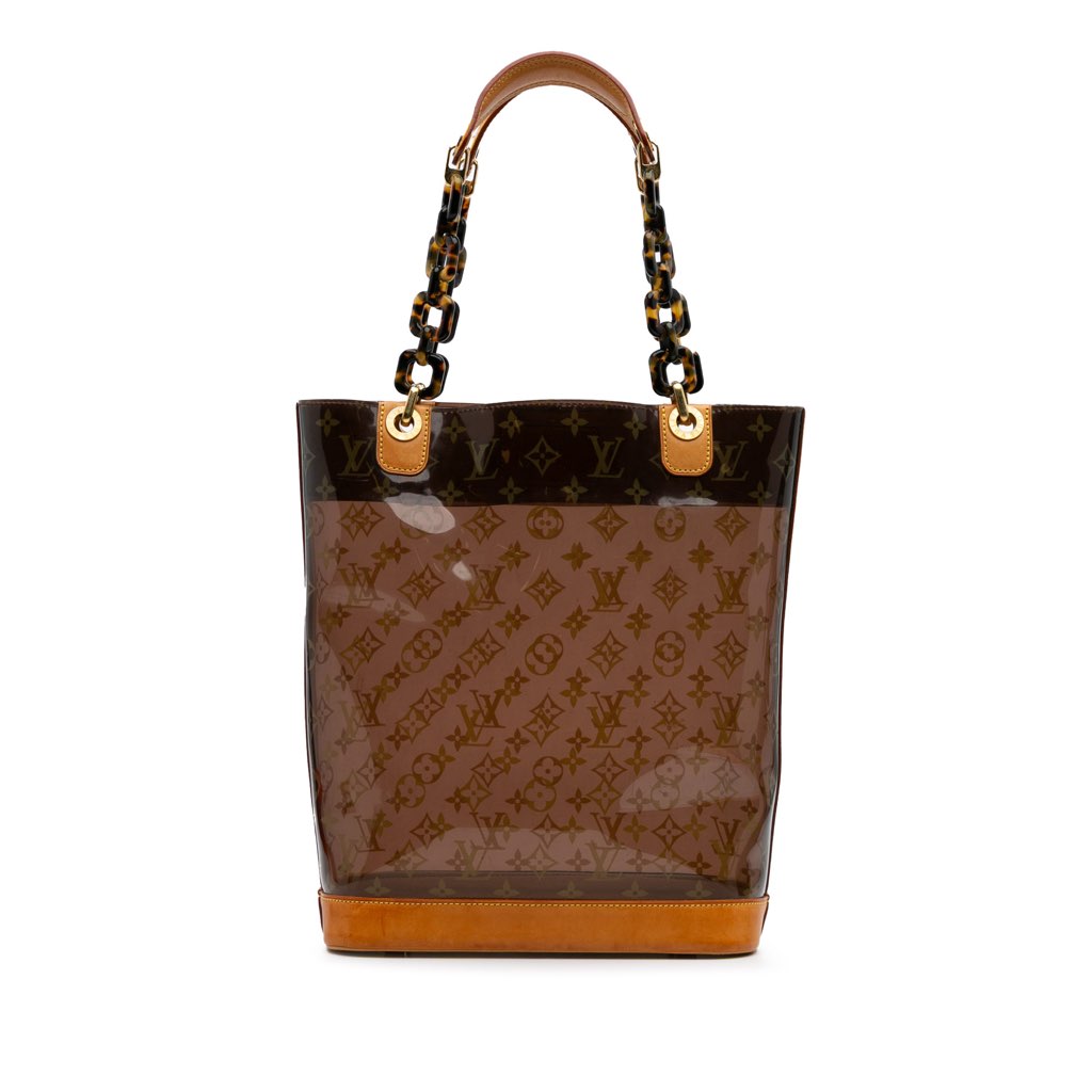 The Cabas Sac Ambre MM features a PVC body with vachetta leather trim, resin chain link straps with a flat vachetta leather shoulder guard, an open top, and a pouch inclusion.
