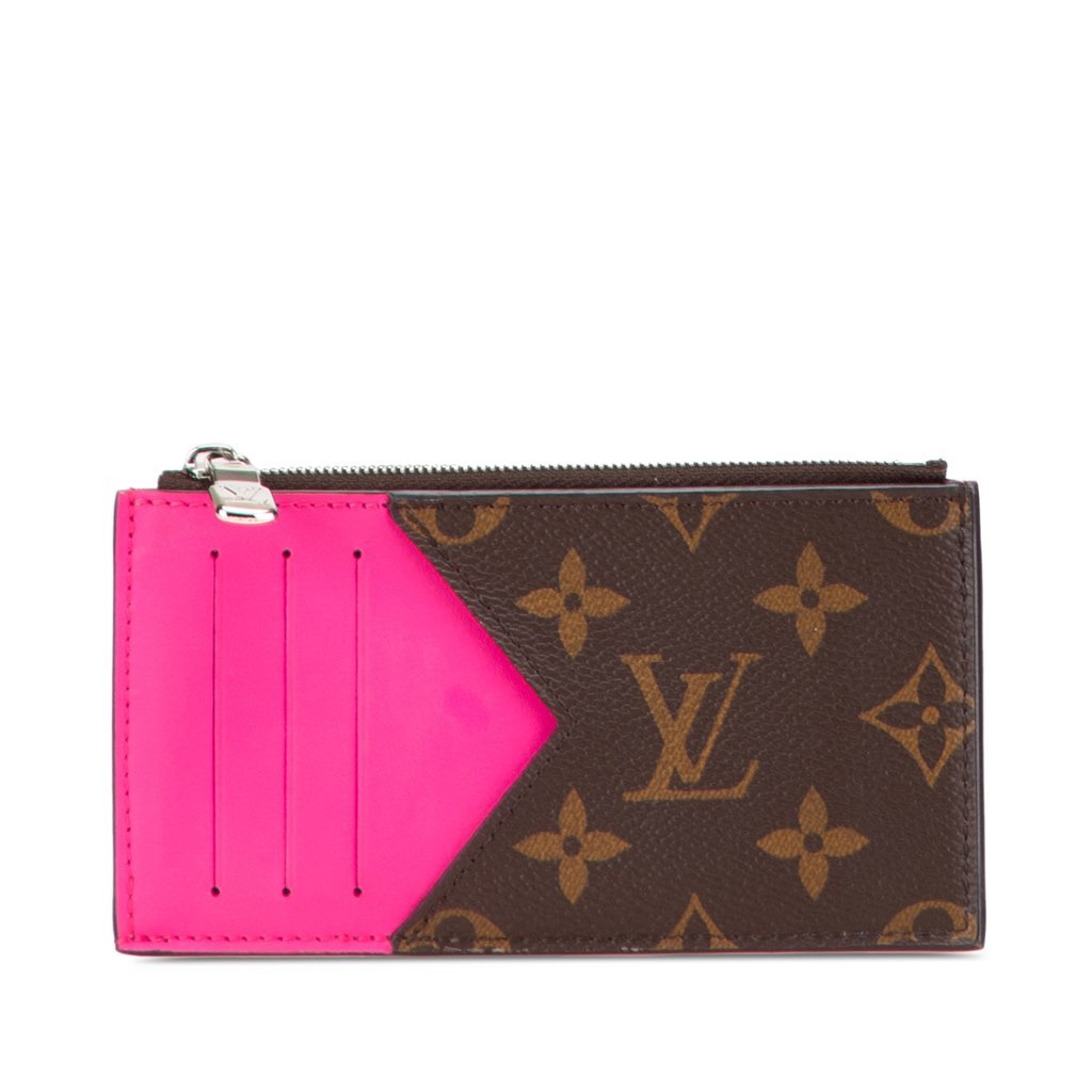 This coin card holder features a monogram canvas body, a top zip closure, and exterior slip pockets.