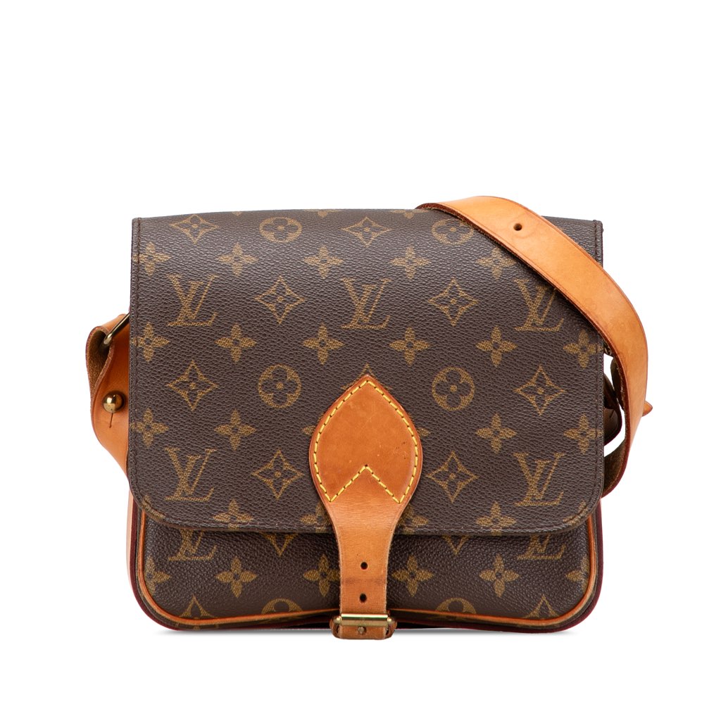 The Cartouchiere MM features a Monogram canvas body with vachetta leather trim, an adjustable flat vachetta strap, and a front flap with a belt buckle closure.