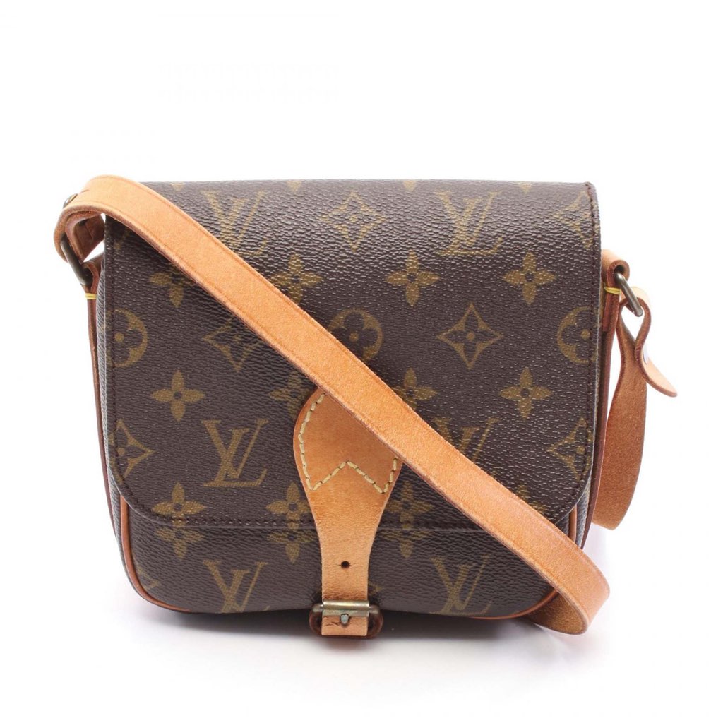 The Cartouchiere PM features a monogram canvas body, an adjustable flat vachetta leather strap, and a front flap with buckle closure.