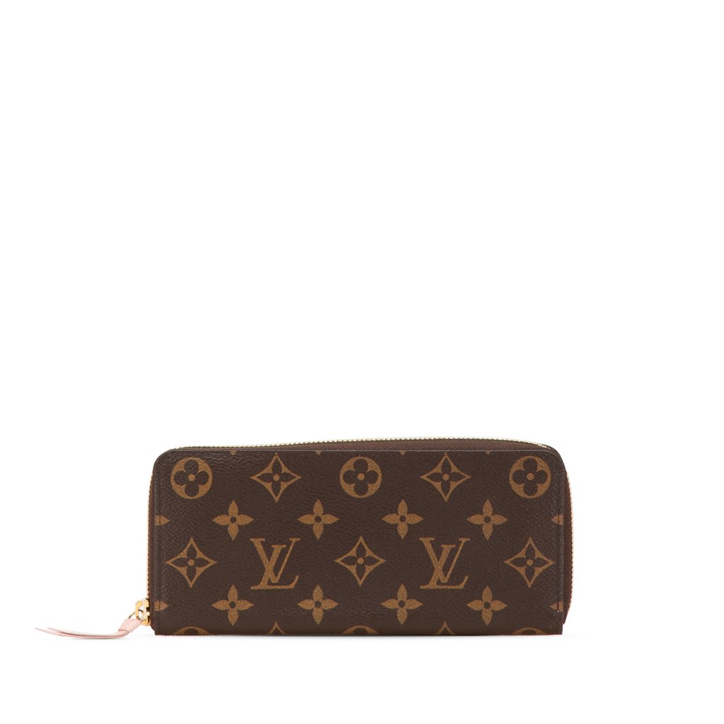 The Clemence wallet features a monogram canvas body, a zip around closure, and interior zip and slip pockets.