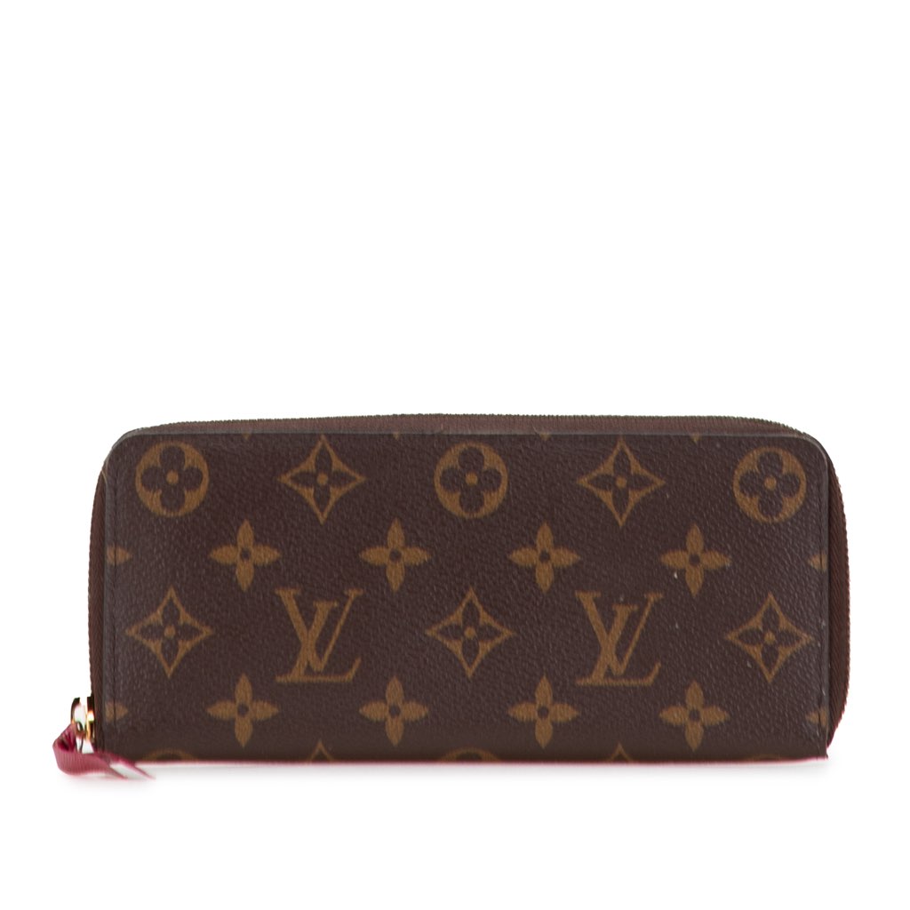 The Clemence wallet features a monogram canvas body, a zip around closure, and interior zip and slip pockets.