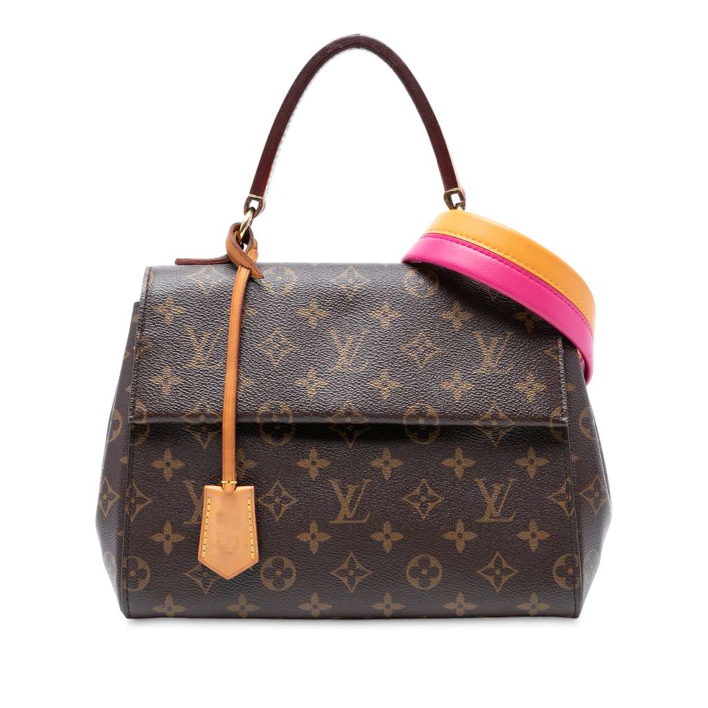The Cluny BB features a monogram canvas body, a flat vachetta leather top handle, a detachable flat leather strap, a flap with magnetic snap closure, and interior zip and slip pockets.