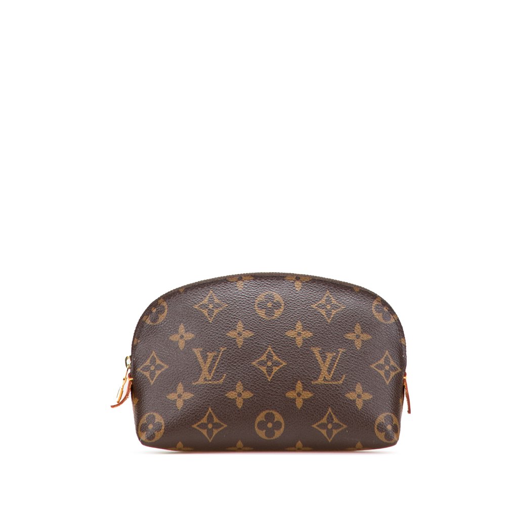 This cosmetic pouch features a monogram canvas body, a top zip closure, and an interior slip pocket.