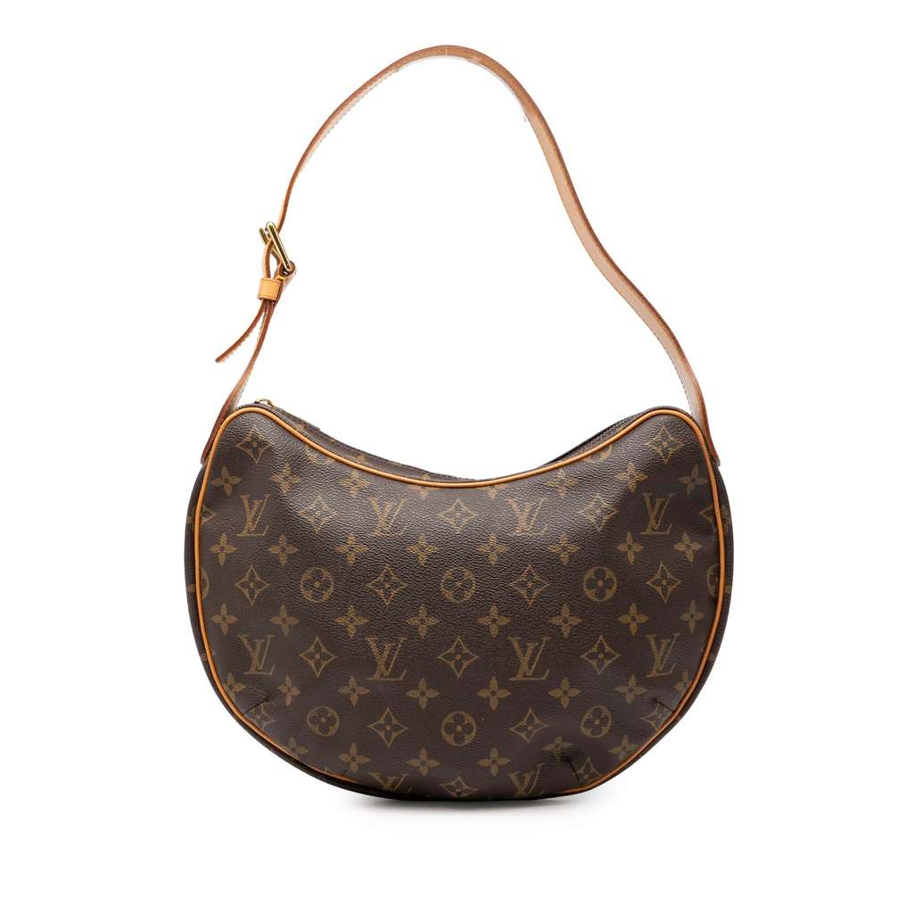 The Croissant MM features a monogram canvas body, a flat vachetta shoulder strap, a top zip closure, and an interior slip pocket.