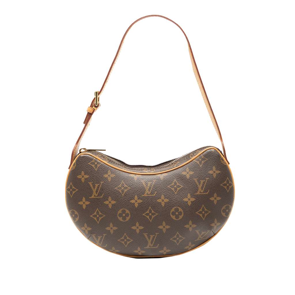 The Croissant PM features a monogram canvas body, a flat leather strap, a top zip closure, and an interior slip pocket.