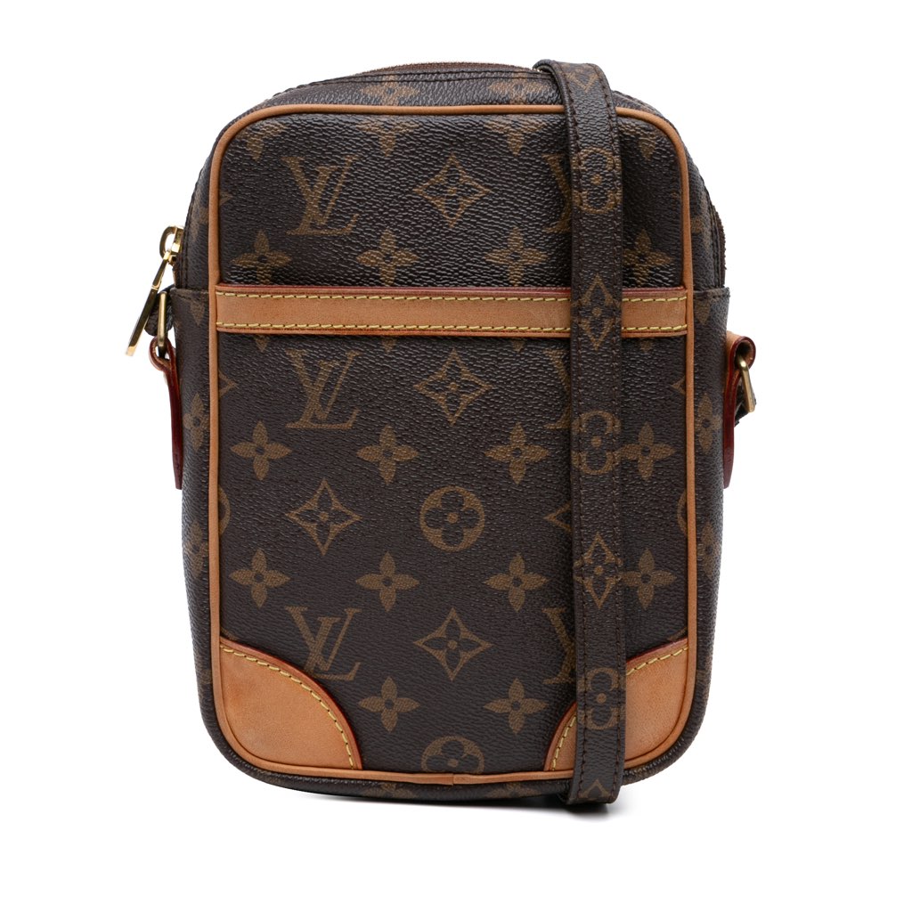 The Danube features a monogram canvas body with vachetta leather trim, an adjustable shoulder strap with leather details, a top zip closure, an exterior front slip pocket, and an interior slip pocket.