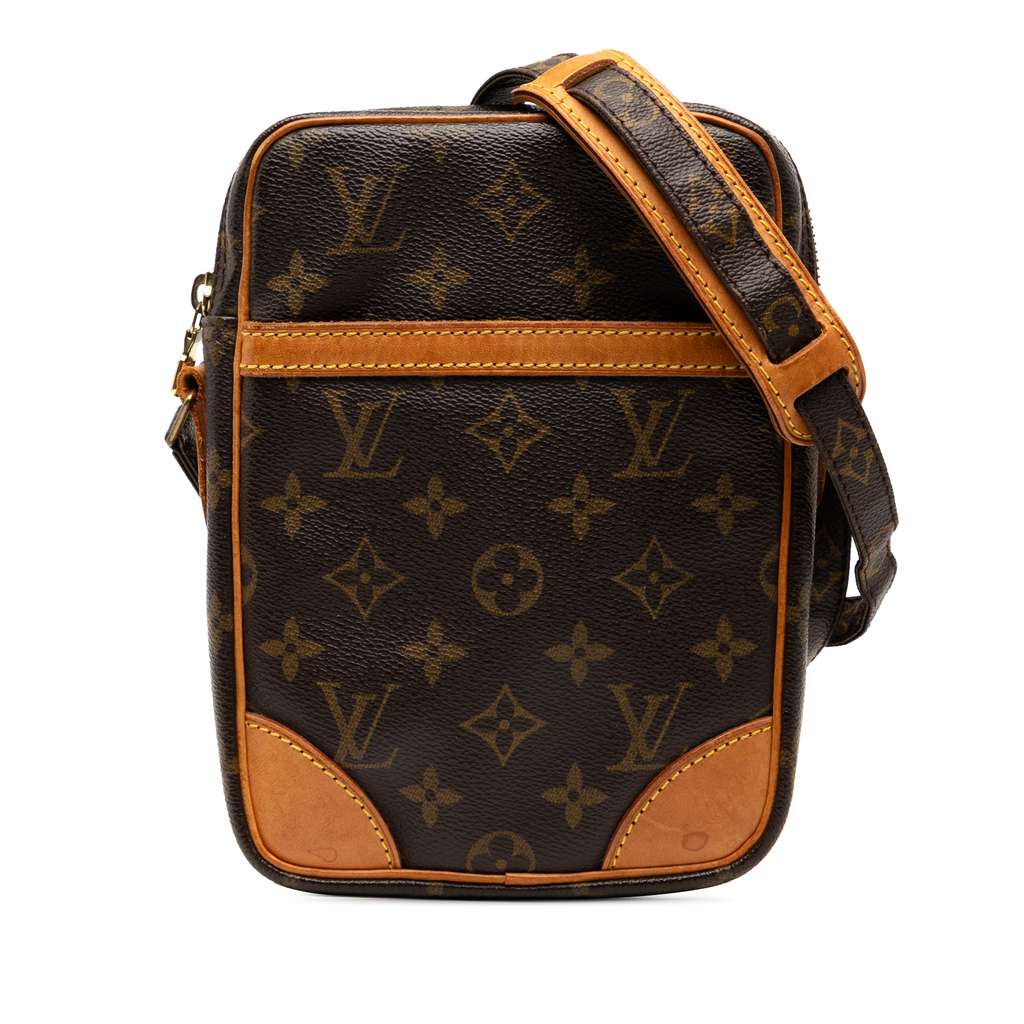 The Danube features a monogram canvas body with vachetta leather trim, an adjustable shoulder strap with leather details, a top zip closure, and an exterior front slip pocket.