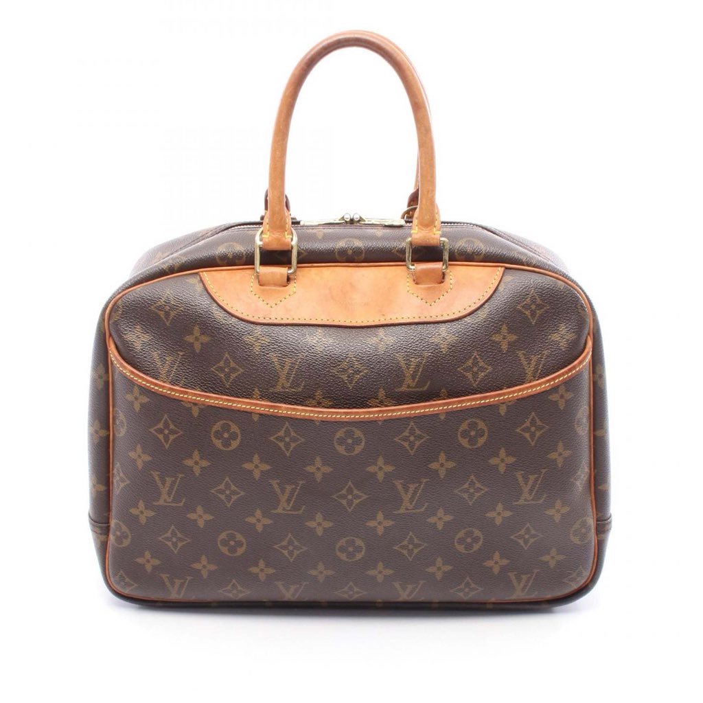 The Deauville features a monogram canvas body with vachetta leather trim, rolled vachetta leather handles, an exterior slip pocket, a top zip closure, and interior open pockets.