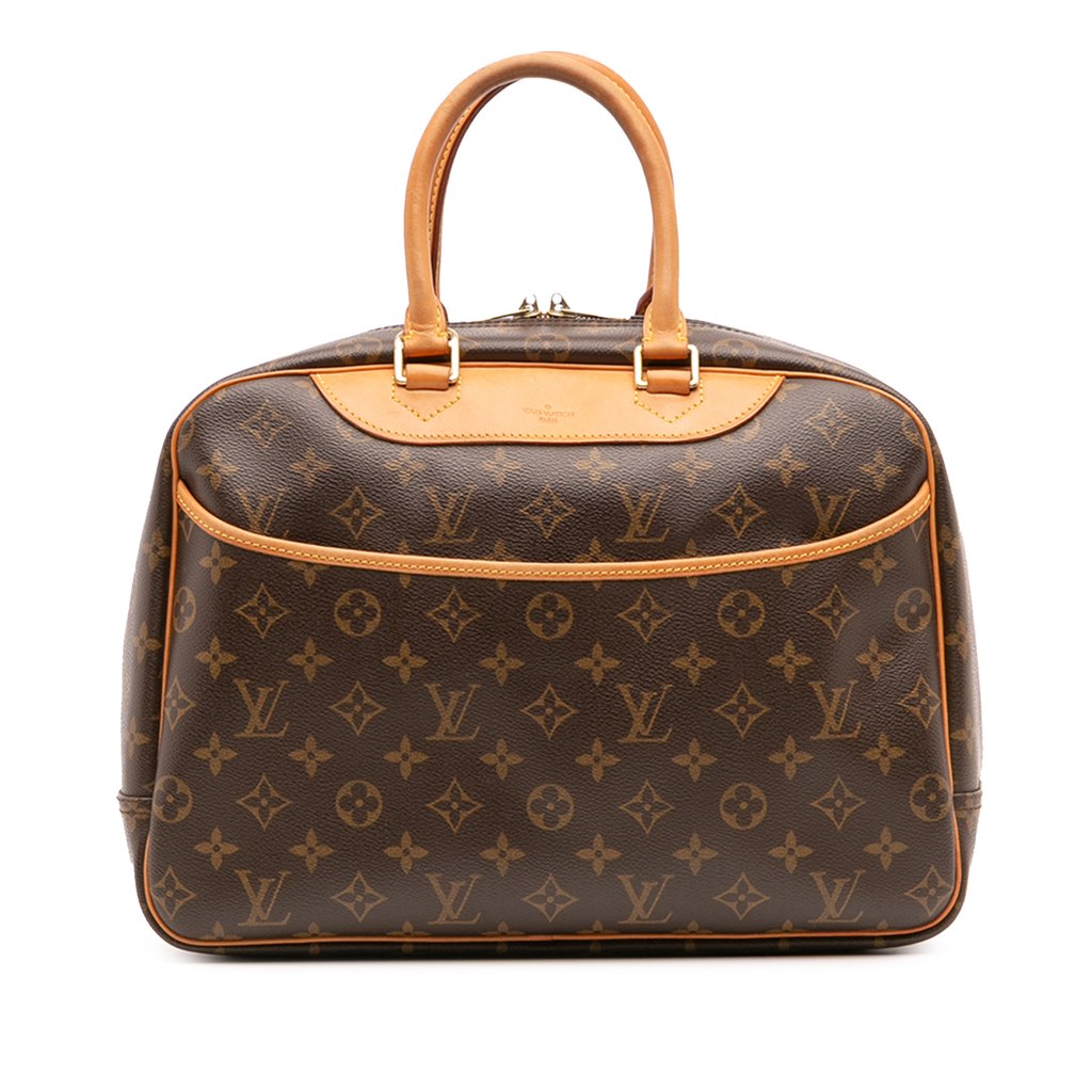 The Deauville features a monogram canvas body with vachetta leather trim, rolled vachetta leather handles, an exterior slip pocket, a top zip closure, and interior open pockets.