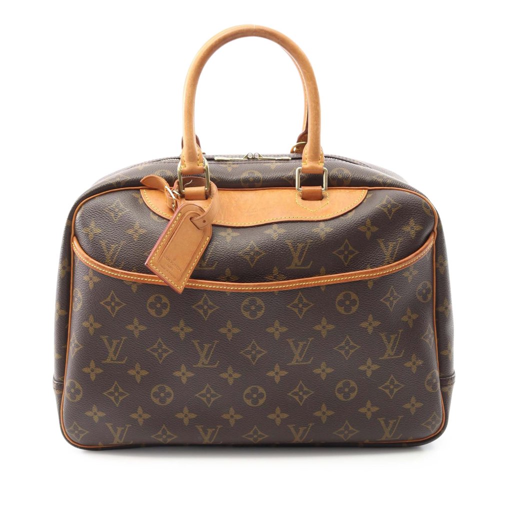 The Deauville features a monogram canvas body with vachetta leather trim, rolled vachetta leather handles, an exterior slip pocket, a top zip closure, and interior slip pockets.