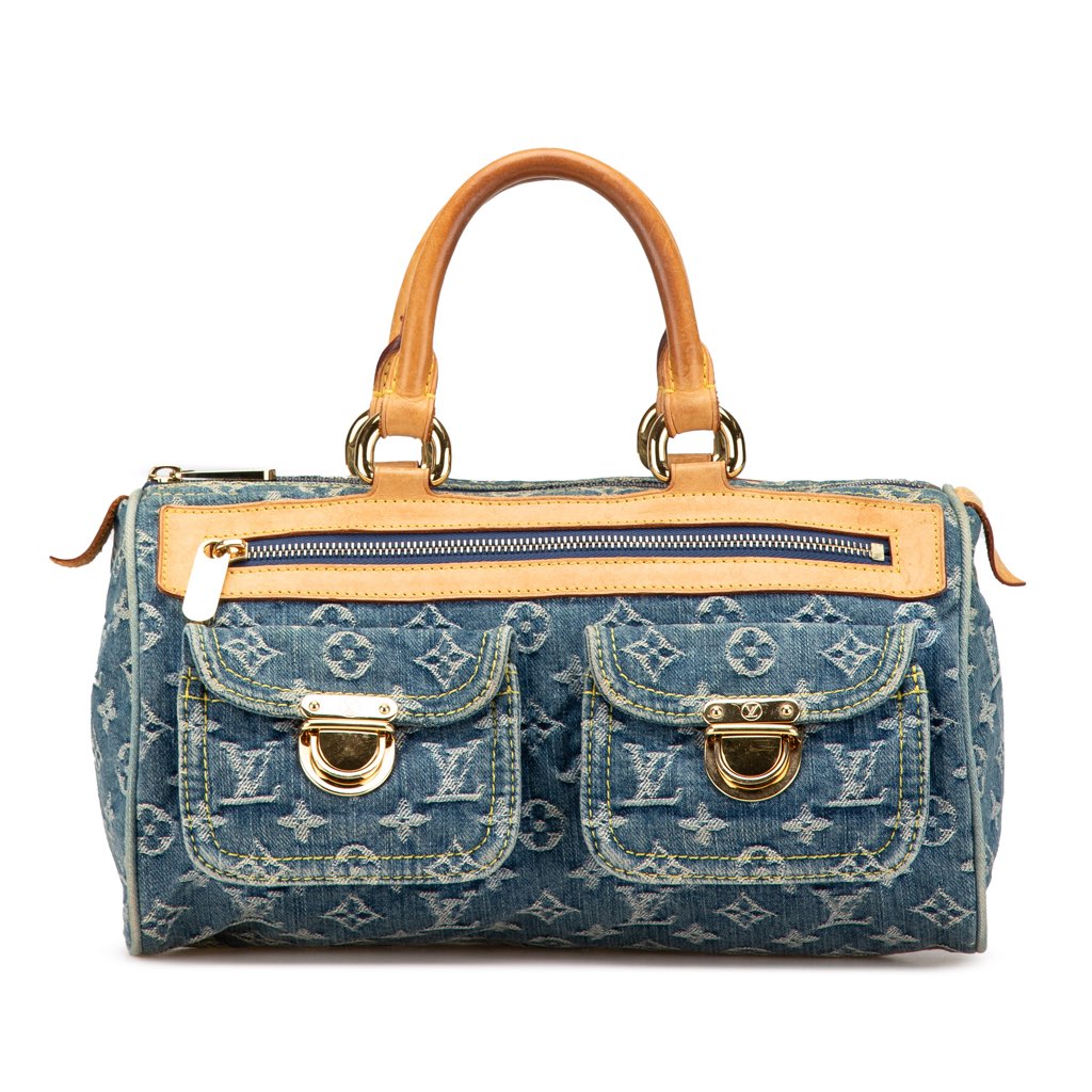 The Neo Speedy features a monogram denim body with vachetta leather trim, rolled vachetta leather handles, a top zip closure, exterior flap pockets with push lock closures, an exterior zip pocket, and an interior slip pocket.