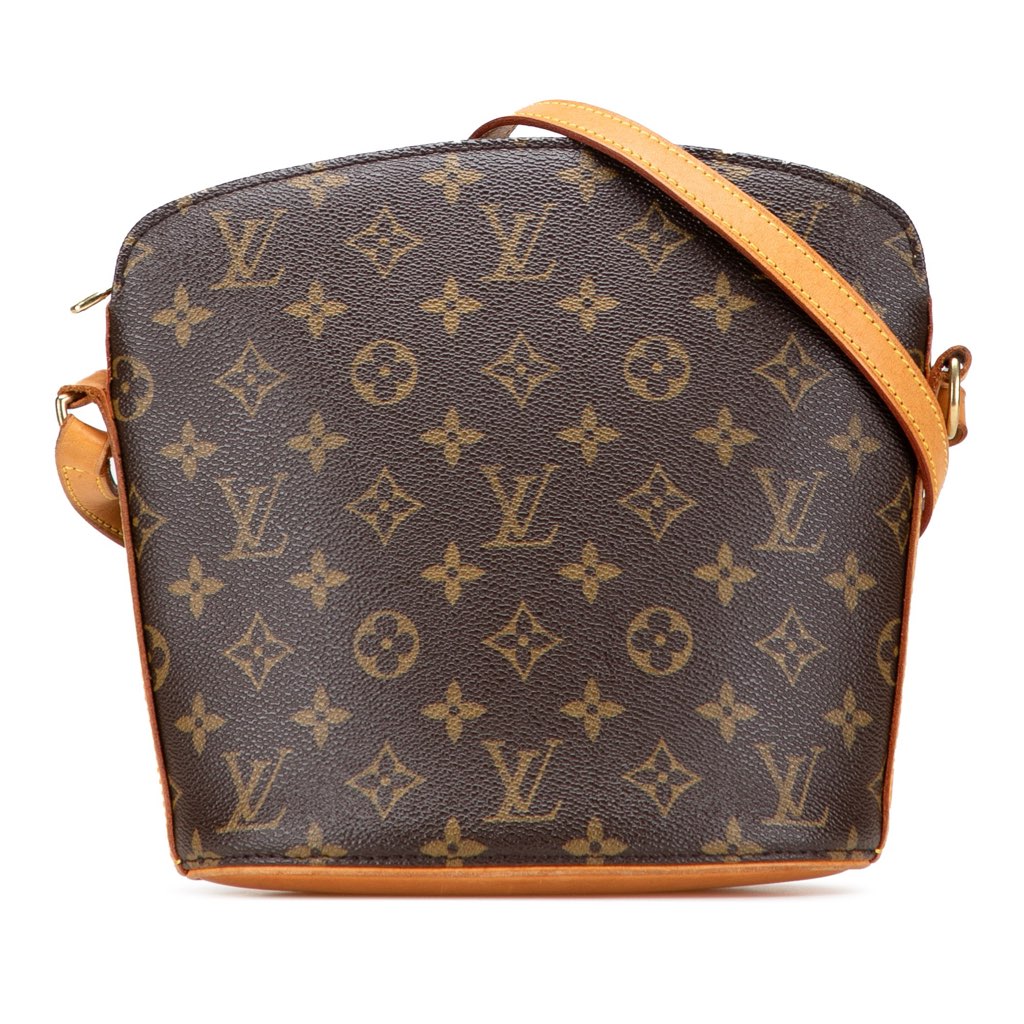 The Drouot features a monogram canvas body, an adjustable flat vachetta leather shoulder strap, a top zip closure, and an interior slip pocket.