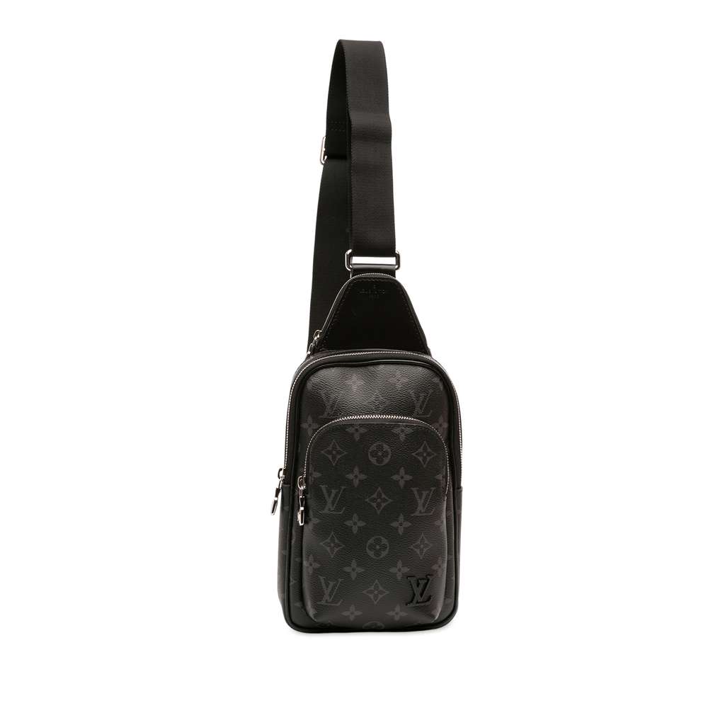 The Avenue Slingbag PM features monogram eclipse canvas body with leather trim, an adjustable flat strap, a top zip closure, exterior front zip pockets, and an interior slip pocket.