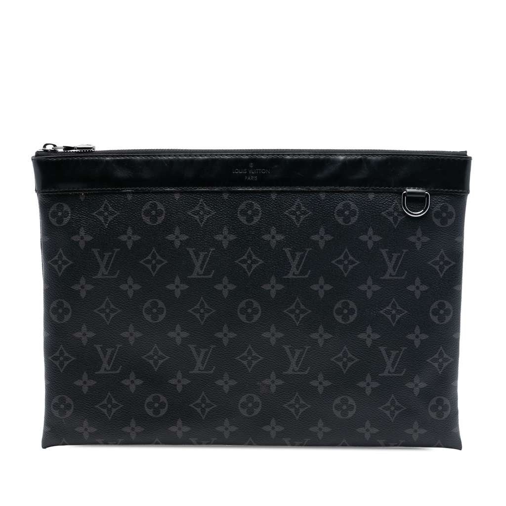The Discovery Pochette features a monogram eclipse body with leather trim, a top zip closure, and an interior slip pocket.