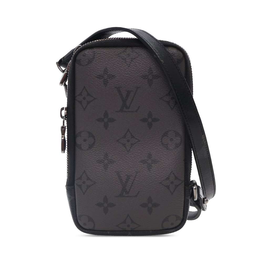 The Double Phone Pouch features a monogram eclipse reverse canvas body, a detachable flat leather strap, and double zip-around closures.