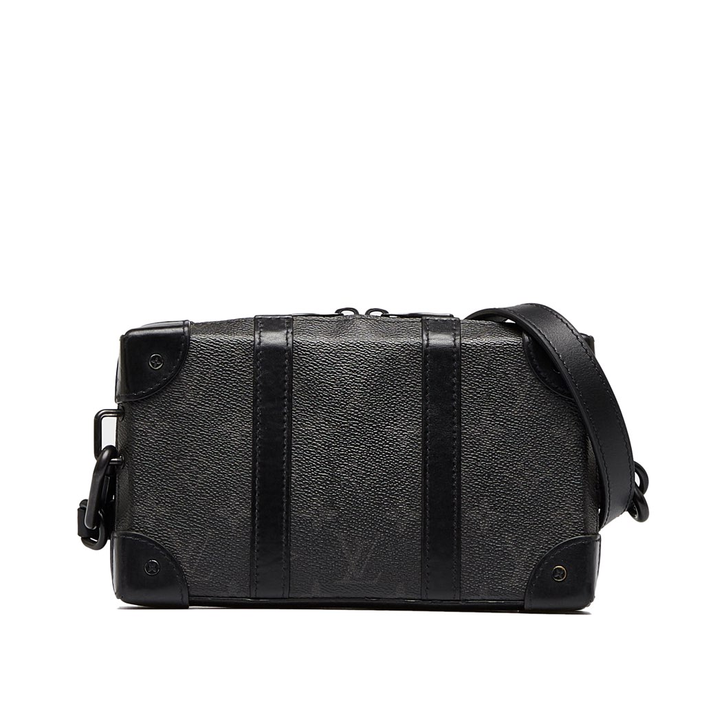 The Monogram Eclipse Soft Trunk Wallet Crossbody features a monogram eclipse canvas body, single adjustable shoulder strap, zip closure at top, twill lining and dual interior pockets with card slots.
