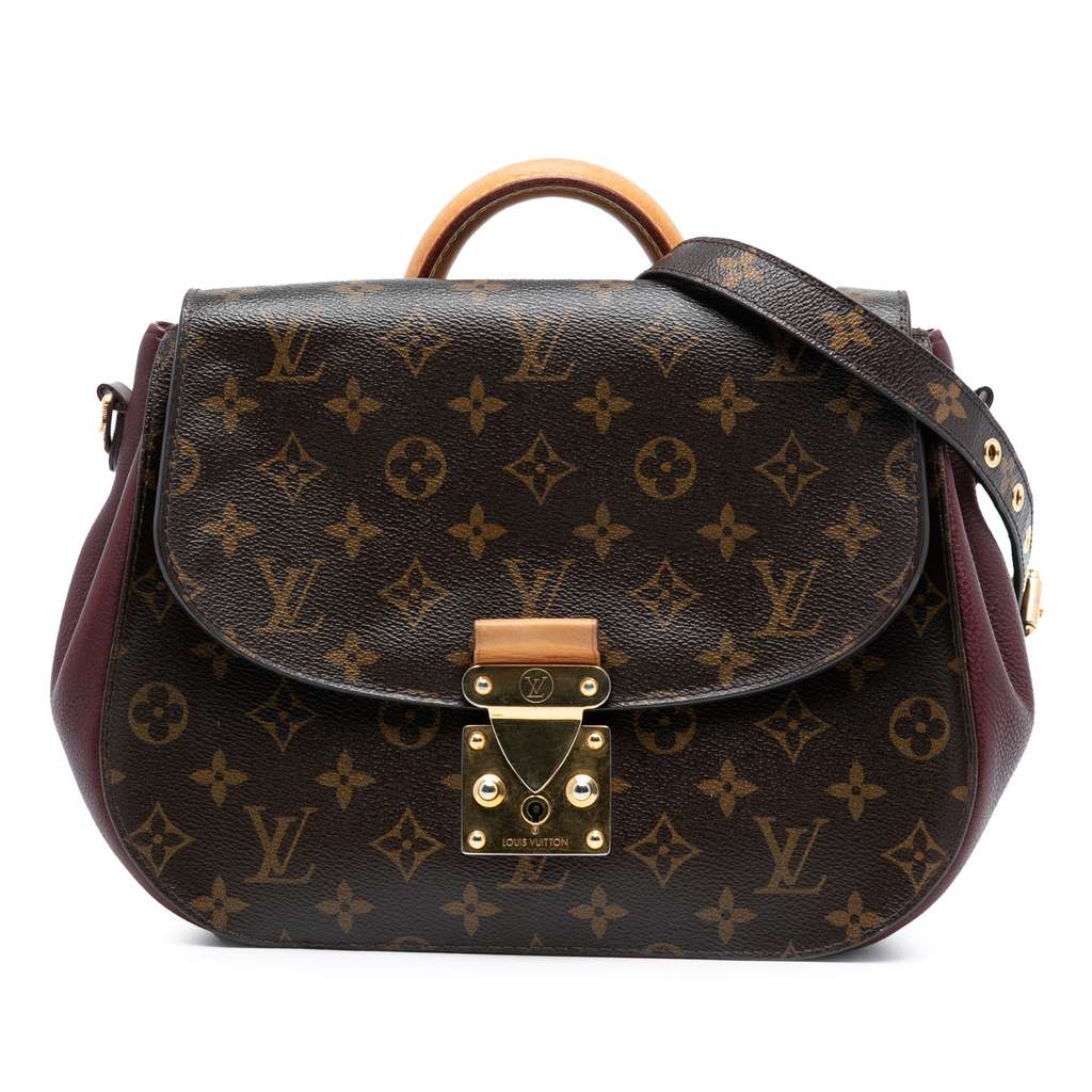 The Eden MM features a monogram canvas and leather body, a rolled vachetta leather top handle, an adjustable and detachable flat shoulder strap, a front flap with S-lock closure, exterior back zip pocket, and interior zip and slip pockets.