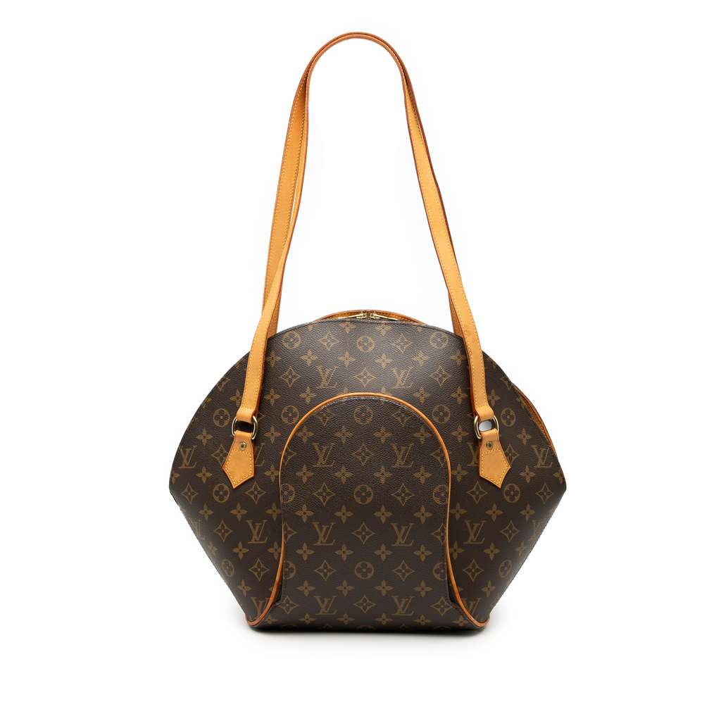 The Ellipse Shopper features a monogram canvas body, flat vachetta leather straps, a top zip closure, and an interior slip pocket.