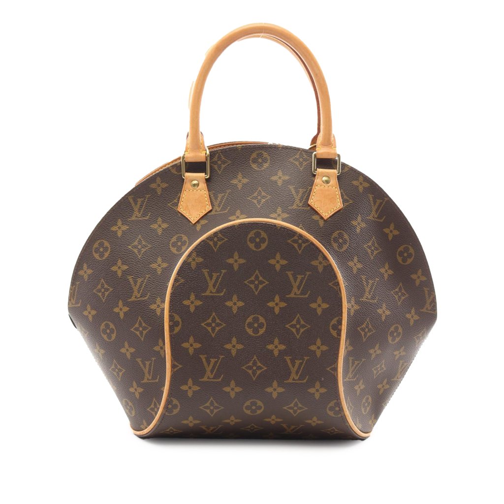 The Ellipse features a monogram canvas body with vachetta leather trim, rolled vachetta leather handles, a top zip closure and an interior slip pocket.