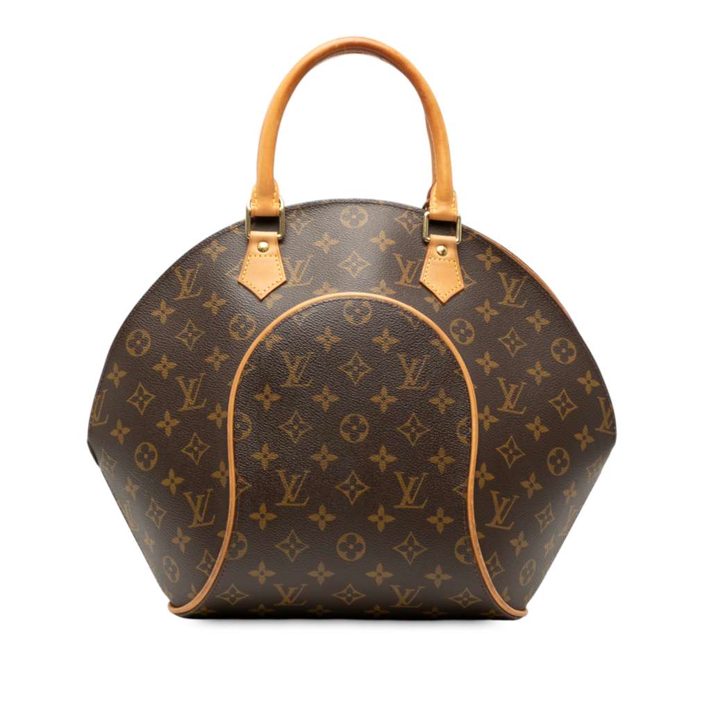 The Ellipse features a monogram canvas body with vachetta leather trim, rolled vachetta leather handles, a top zip closure, and an interior slip pocket.