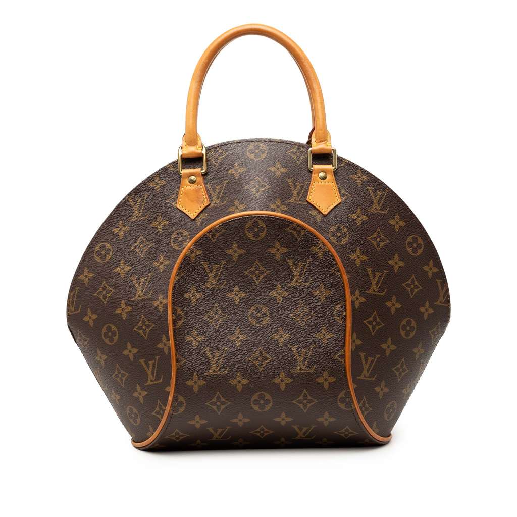 The Ellipse features a monogram canvas body with vachetta leather trim, rolled vachetta leather handles, a top zip closure and an interior slip pocket.