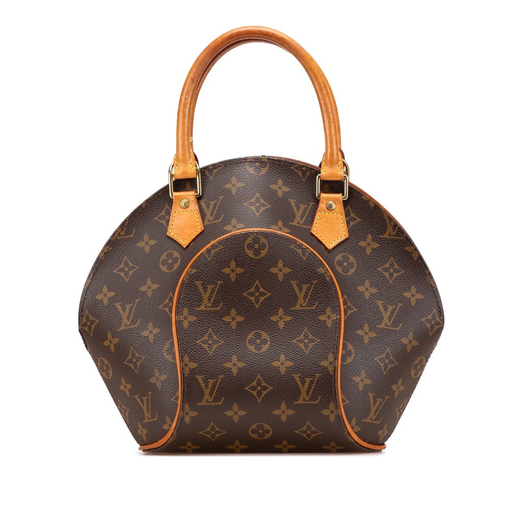The Ellipse PM features a structured monogram canvas body with vachetta leather trim, rolled vachetta leather handles, a top zip closure, and an interior slip pocket.