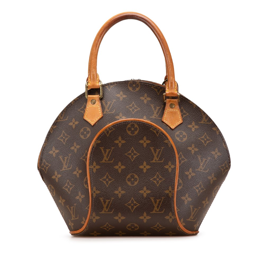 The Ellipse PM features a structured monogram canvas body with vachetta leather trim, rolled vachetta leather handles, a top zip closure, and an interior slip pocket.