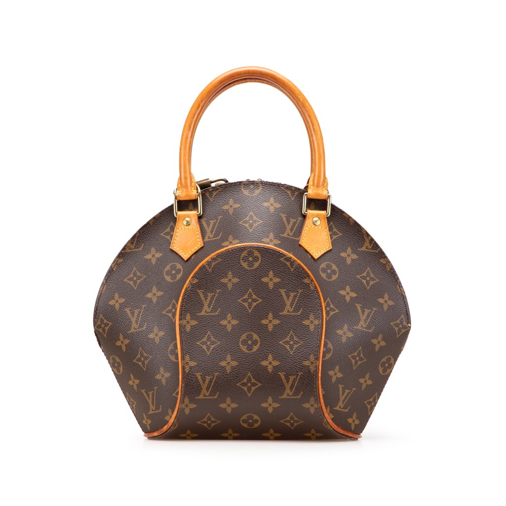 The Ellipse PM features a structured monogram canvas body with vachetta leather trim, rolled vachetta leather handles, a top zip closure, and an interior slip pocket.