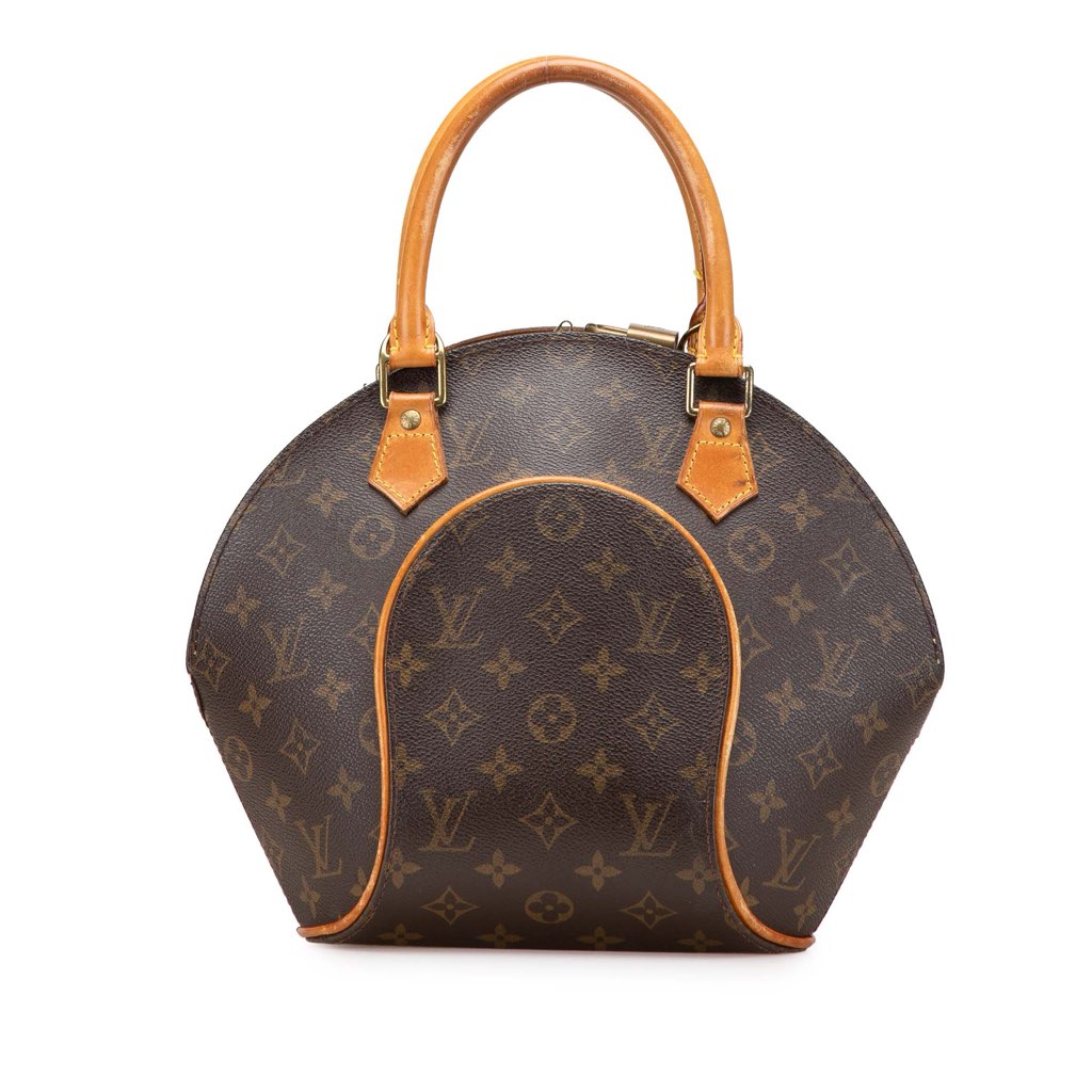 The Ellipse PM features a structured monogram canvas body with vachetta leather trim, rolled vachetta leather handles, a top zip closure, and an interior slip pocket.