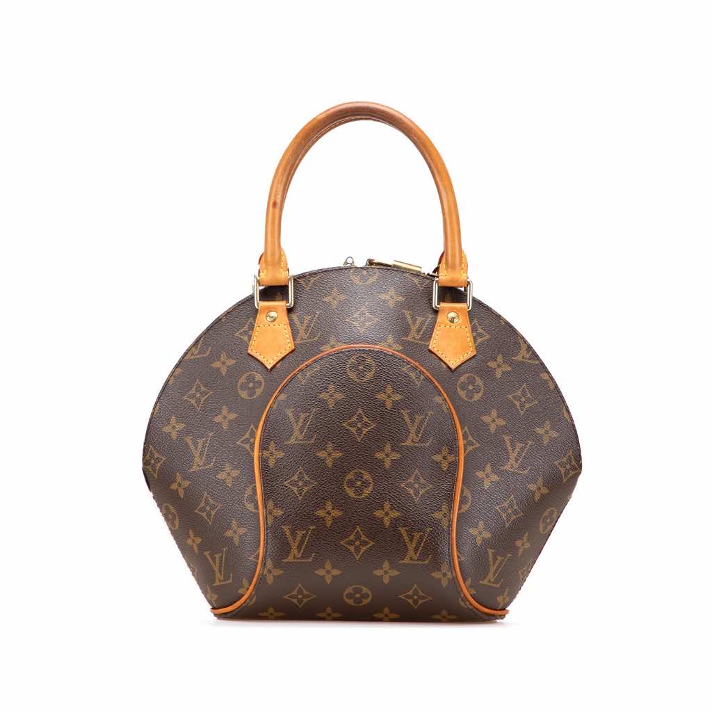 The Ellipse PM features a structured monogram canvas body, rolled vachetta leather handles, a top zip closure, and an interior slip pocket.