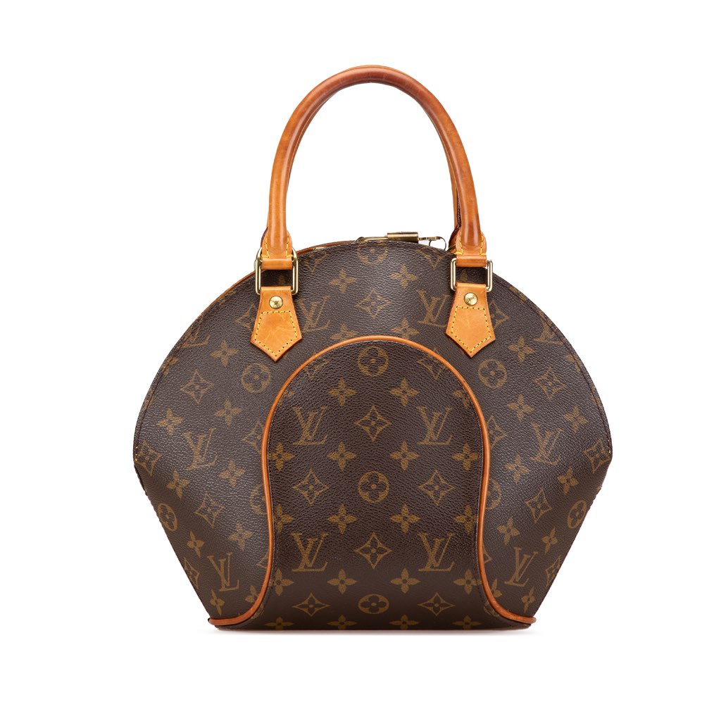 The Ellipse PM features a structured monogram canvas body, rolled vachetta leather handles, a top zip closure, and an interior slip pocket.