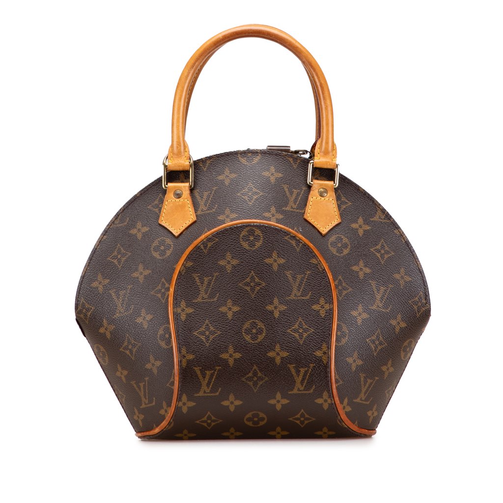 The Ellipse PM features a structured monogram canvas body, rolled leather handles, a top zip closure, and an interior slip pocket.