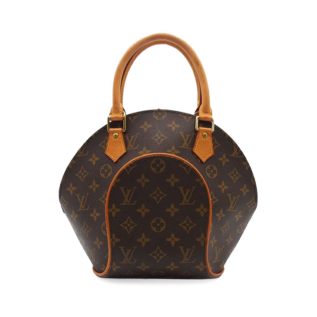 The Ellipse PM features a structured monogram canvas body with vachetta leather trim, rolled vachetta leather handles, a top zip closure, and an interior slip pocket.