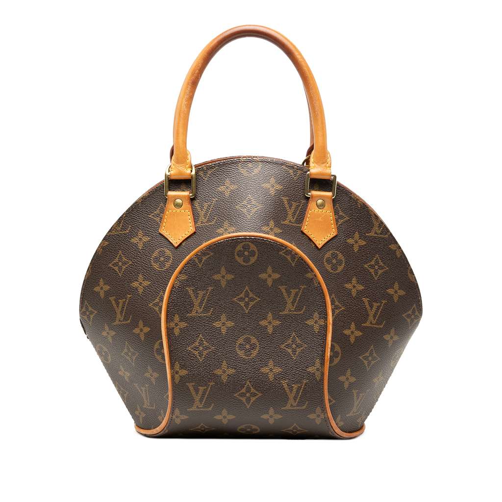 The Ellipse PM features a structured monogram canvas body, rolled leather handles, a top zip closure, and an interior slip pocket. Handles has been repainted.