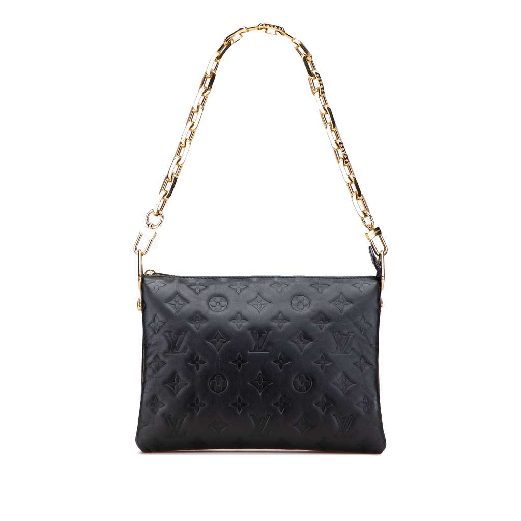 The Coussin PM features an embossed lambskin leather body, a chain link handle, a detachable flat canvas strap, a top zip closure, and an interior zip compartment.