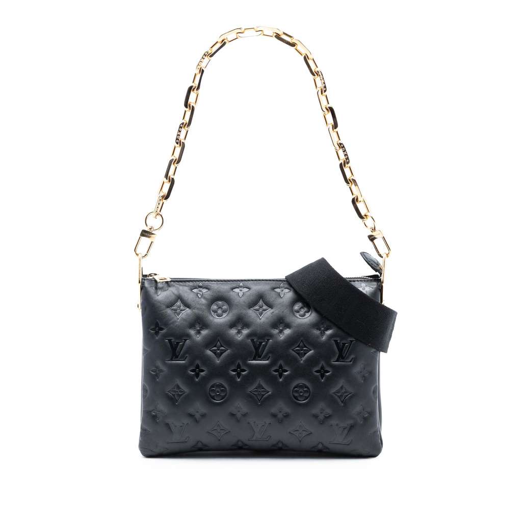 The Coussin PM features an embossed puffy lambskin leather body, a gold-tone chain handle, a detachable flat canvas strap, a top zip closure, and interior zip and open compartments.