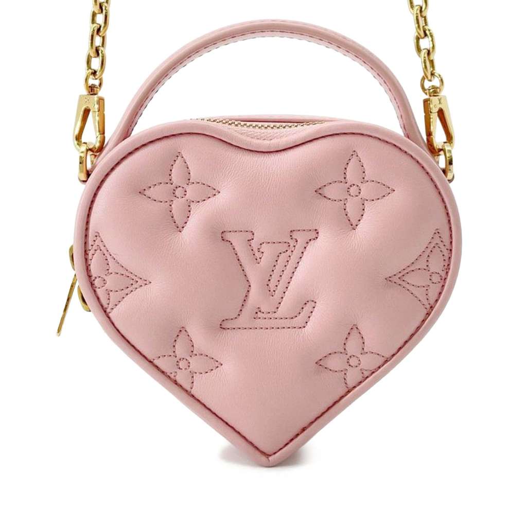 The Pop My Heart Pouch features an embroidered monogram leather body, a flat leather top handle, a detachable gold-tone chain link strap, and a top zip closure.