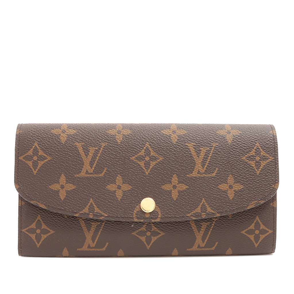 The Emilie wallet features a monogram canvas body, a front flap with snap button closure, and interior zip and slip pockets.
