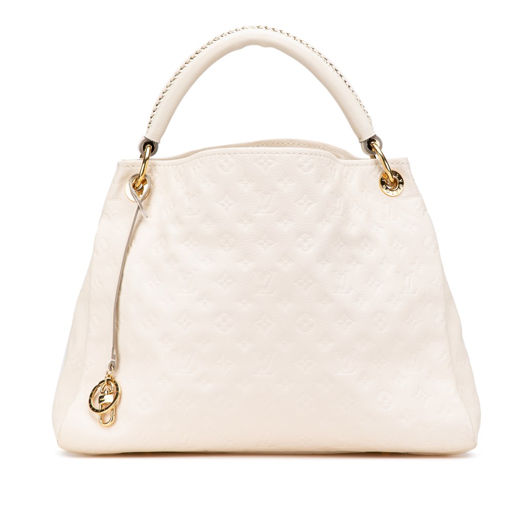 The Artsy MM features a monogram empreinte leather body, a rolled leather strap, an open top, and interior zip and slip pockets.