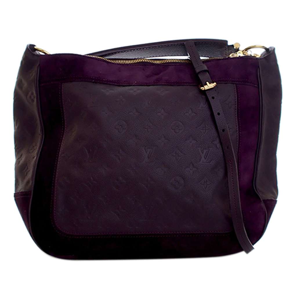 The Audacieuse MM features a monogram empreinte and suede leather body, a flat top handle, a detachable strap, a top zip closure, and interior zip and slip pockets.