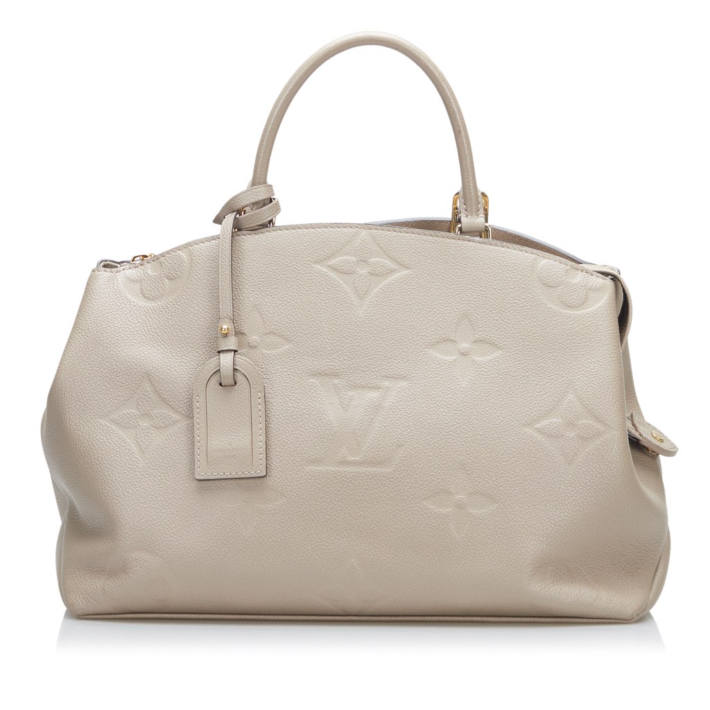 The Giant Palais features a monogram empreinte body in shade Tourterelle, rolled handles, a detachable flat strap, a top zip closure and interior zip and slip pockets.