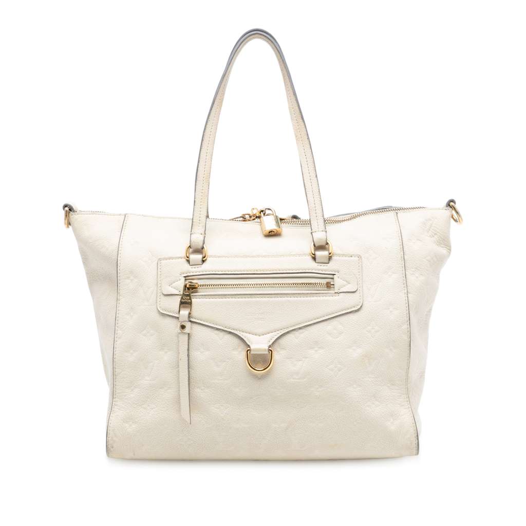 The Lumineuse PM features a monogram empreinte leather, flat leather handles, a detachable flat leather strap, top zip closure, an exterior front zip pocket, and an interior zip pocket.