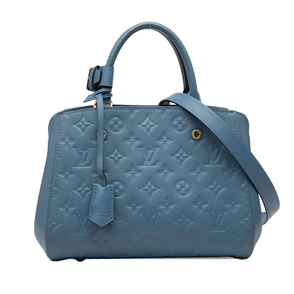 The Montaigne BB features a monogram empreinte body, rolled leather handles, a detachable flat leather shoulder strap, an open top with clasp closure, an interior zip compartment, and interior slip pockets.