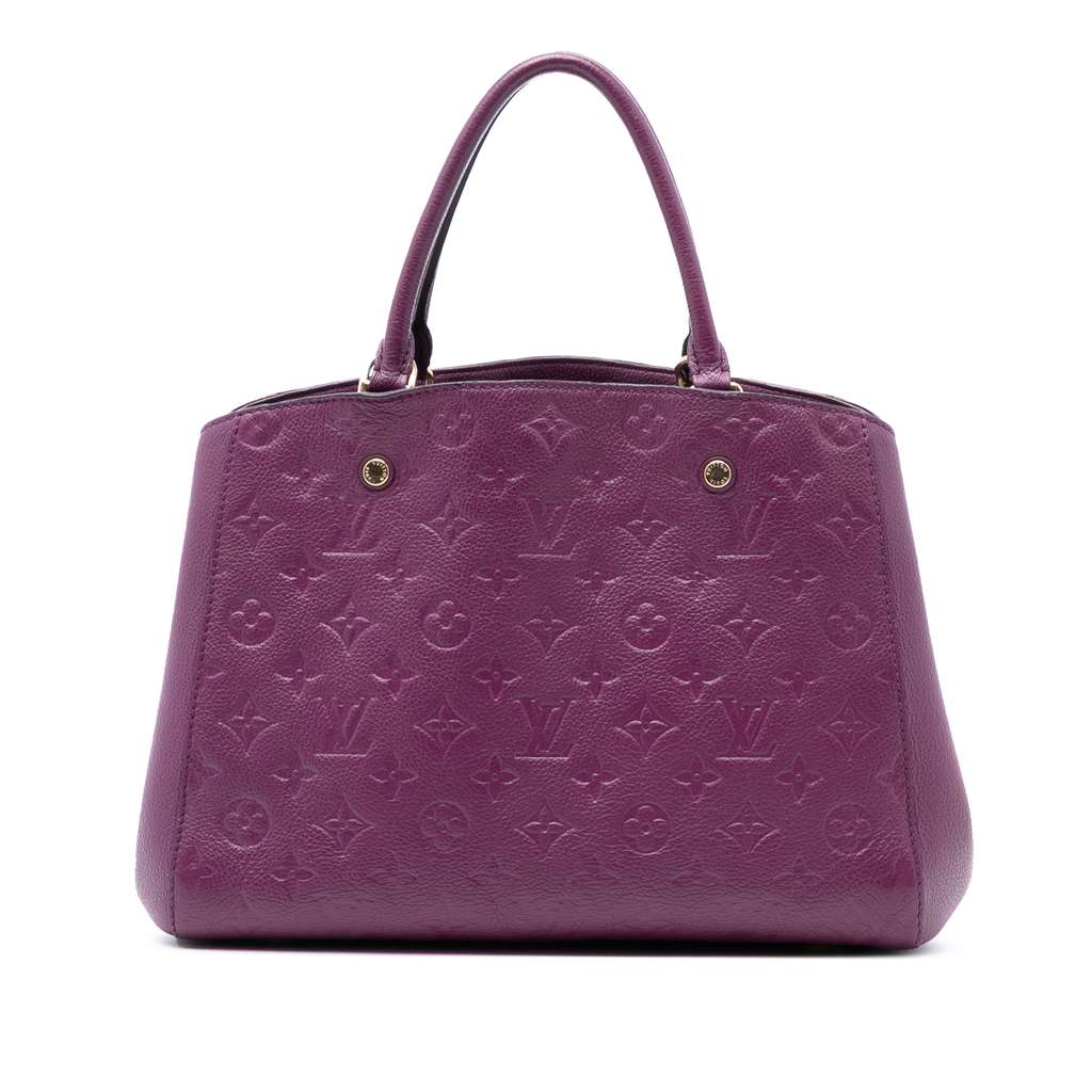 The Montaigne MM features an empreinte leather body, rolled leather handles, an open top with claw clasp closure, and interior zip and slip pockets.