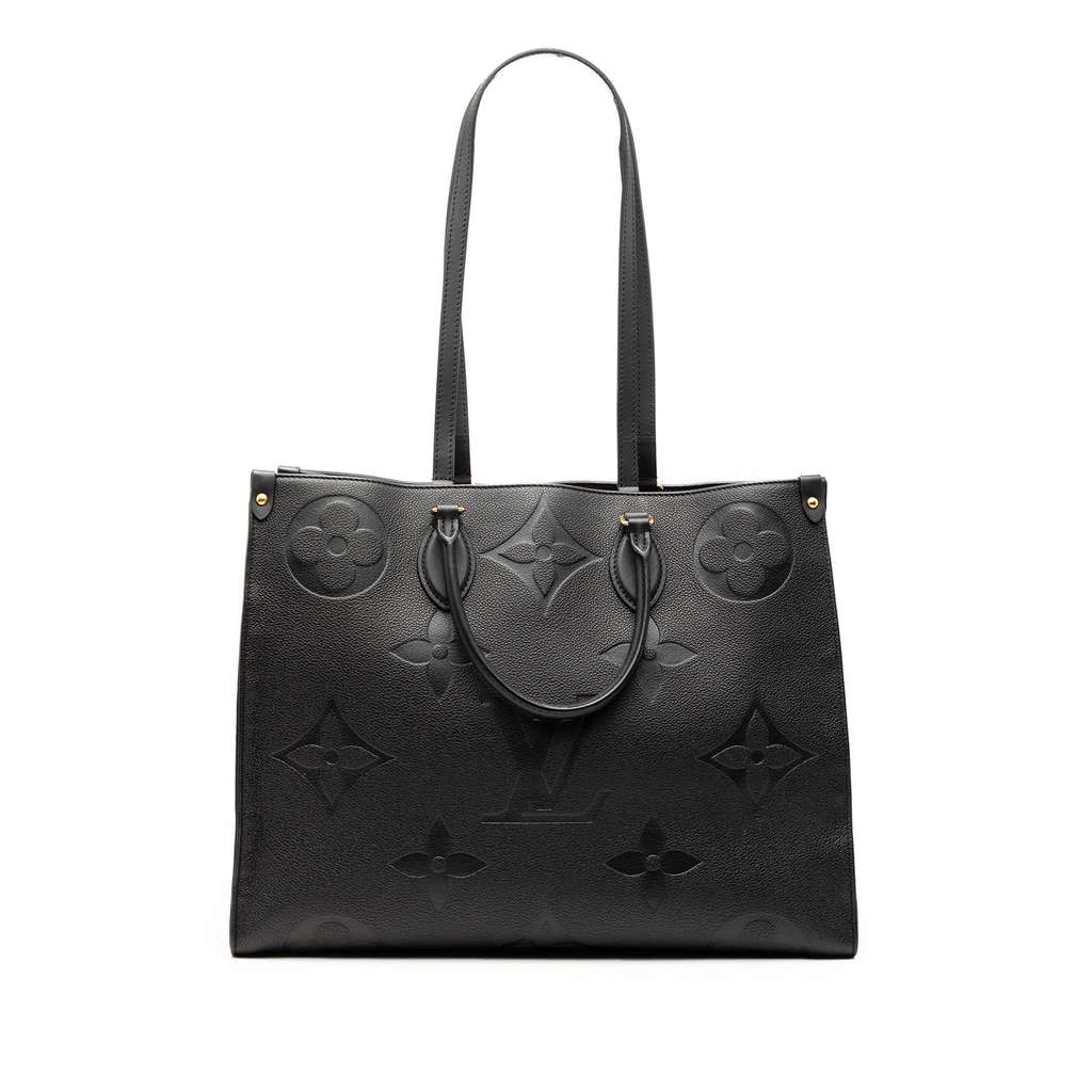 The Onthego features a monogram empreinte leather body, rolled leather handles, flat leather shoulder straps, an open top with lobster clasp closure, and interior zip and slip pockets.