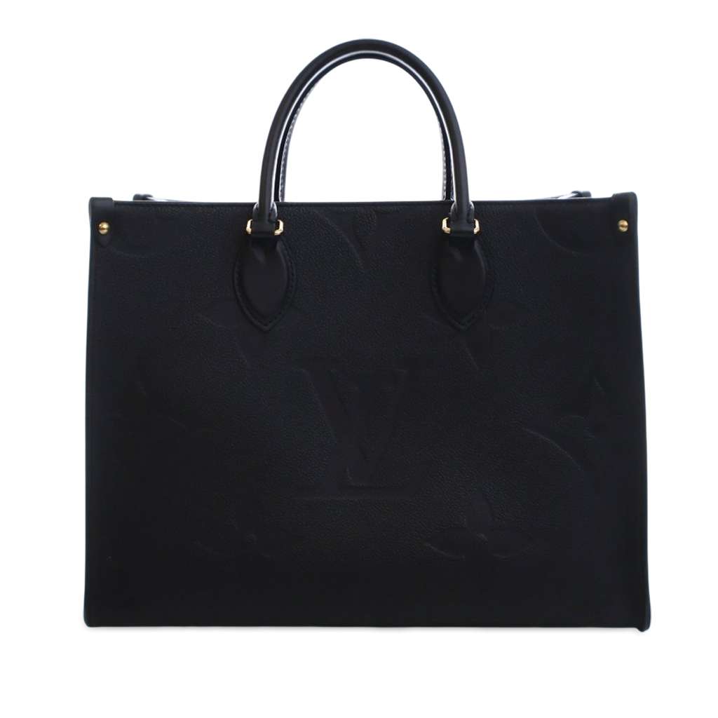The Onthego features a grained embossed leather body, rolled handles, flat shoulder straps, an open top with lobster clasp closure, and interior zip and slip pockets.
