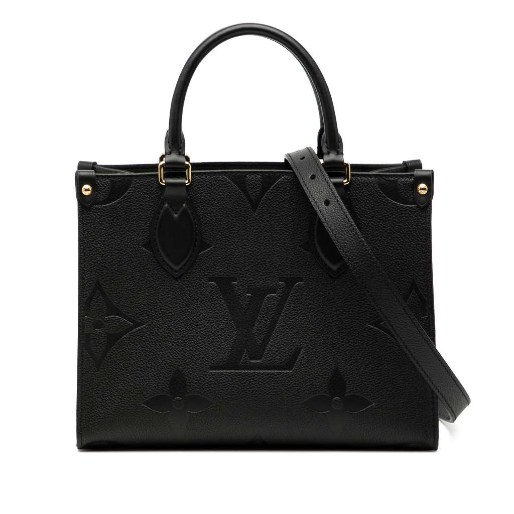 The Onthego features a monogram empreinte body, rolled handles, flat shoulder handles, a detachable flat strap, an open top with lobster clasp closure, and interior zip and slip pockets.