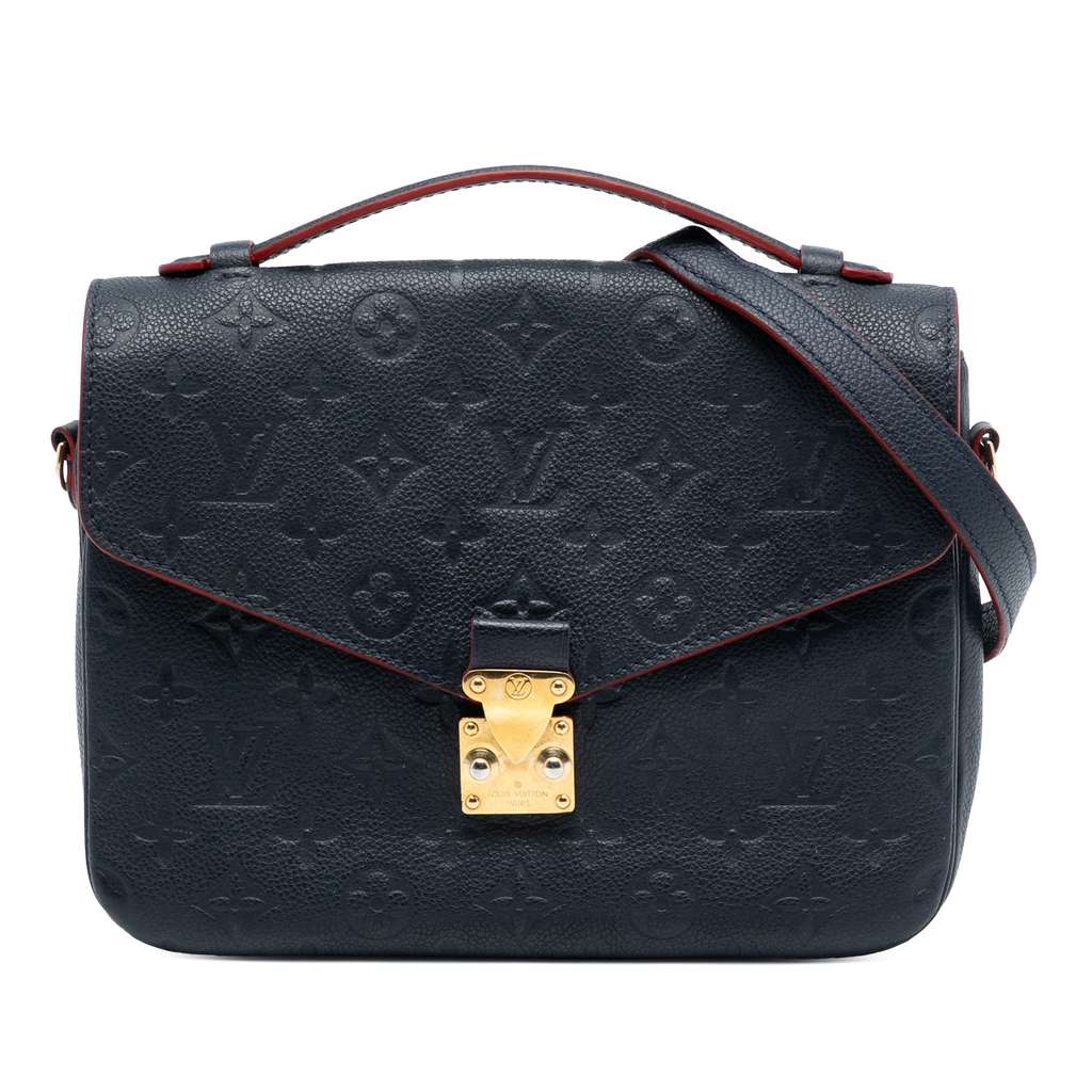 The Pochette Metis features a monogram empreinte leather body, a flat leather top handle, a detachable flat leather strap, a front flap with an S-lock closure, an exterior back zip pocket, open compartments, and an interior slip pocket. The straps and lining were repainted.